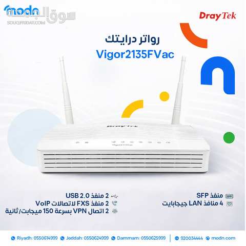 راوتر درايتك Vigor2135FVac – قوة الأداء وأعلى مستويات الأمان في جهاز واحد تقدم مدن الاتصالات السعودية حلول شبكات احترافية تناسب المنازل الذكية والمكاتب الحديثة ومن بين هذه الحلول يأتي راوتر درايتك Vigor2135FVac الذي يجمع بين الأداء العالي، الأمان المتقدم، والإدارة المرنة للشبكات في جهاز واحد إذا كنت تبحث عن راوتر قادر على إدارة اتصال الإنترنت بكفاءة مع حماية قوية للشبكة، فإن راوتر درايتك Vigor2135FVac يعد ...