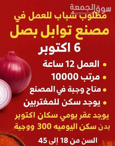 مطلوب شباب للعمل في مصنع توابل بصل في ٦ اكتوبر الشغل 12 ساعه مرتب 10000